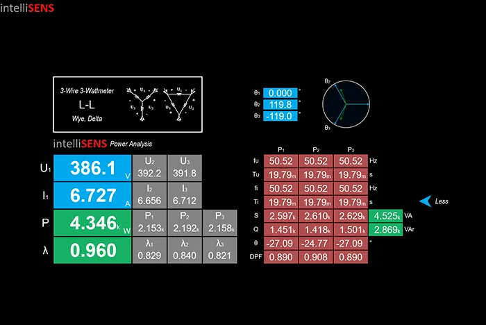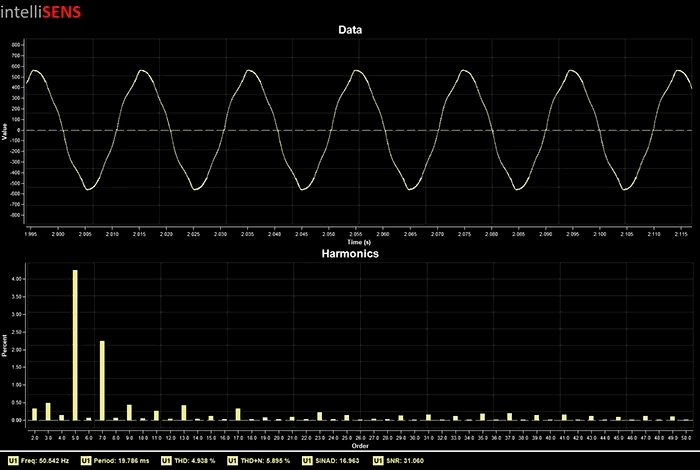 Power electronics designers must comply with standards for parameters, like Power Factor (PF) and Total Harmonic Distortion (THD), while designing power electronics converters and inverters. These measurements are usually performed by power analyzers. The intelliSENS software can measure power quality parameters such as Active Power, Reactive Power, Phase angle and power factor for single and 3 phase systems in optional 3-wattmeter or 2-wattmeter measurement techniques for 3 wire systems and 3-wattmeter technique for 4 wire systems. Moreover, the harmonic analyzer can calculate THD+N and THD up-to the 100th harmonic in dB, percentage and RMS values and display it in bar or table formats similar to traditional power analyzers